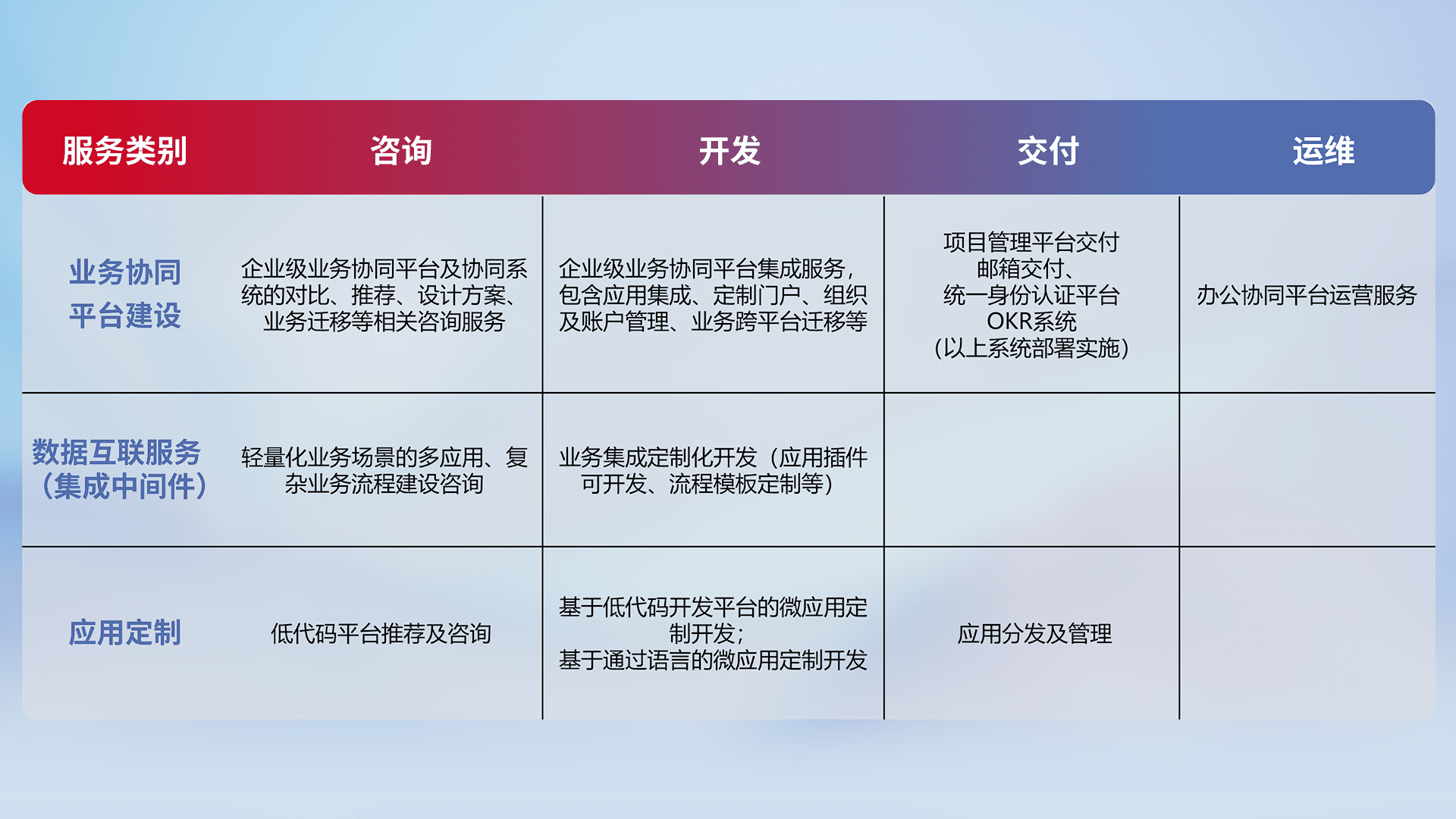 针对钉钉、、、企微、、、IDaas等平台级产品提供产品的规划、、、、方案、、、、交付、、、定制化开发等服务,,,实现如统一协同办公、、、、智能客户服务、、、、混合会议管理、、、智能数据查询、、、等业务场景,,,,实现数字化转型。。。